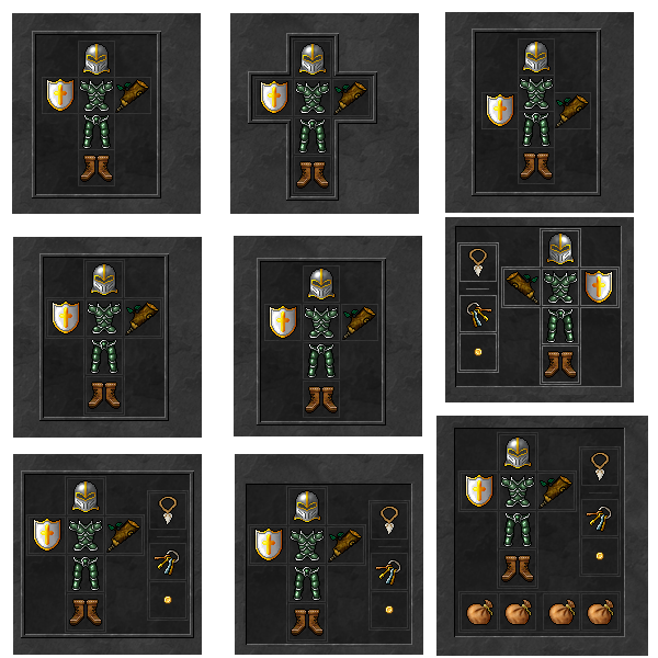We were trying to decide what we wanted to represent on the equipment area of the client. We came up with the following theme with some variations. In the picture the key ring & gold piece are both going to be ring slots, but we have no ring graphics at the moment