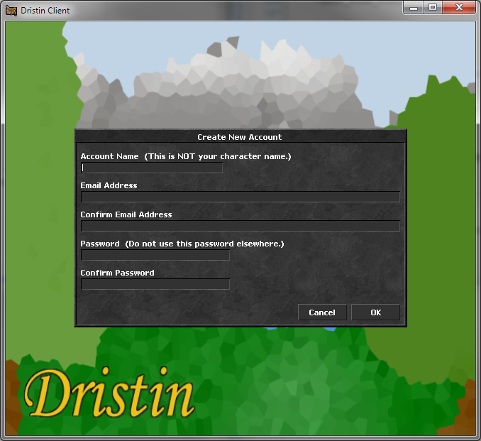 I'm currently working on the account system & database. Account are created using the client, as we feel the website should be an additional resource to the game and not a requirement. Our goal is to be able to do everything needed from within the client itself rather than the website. Right now creating a character is pretty simple as you just type the name and select the sex, but in the future we will most likely add the ability to set your outfit during character creation.